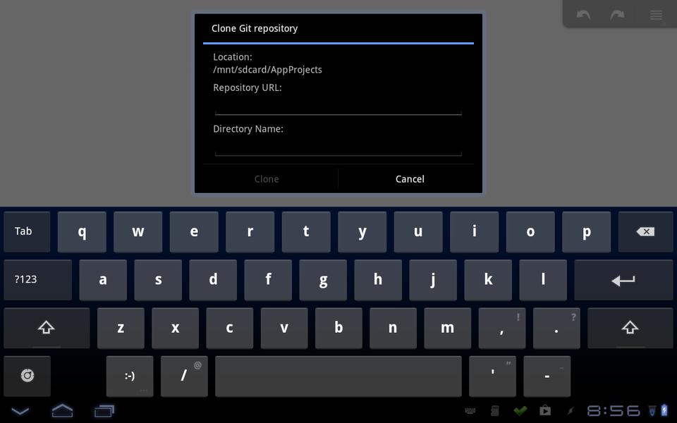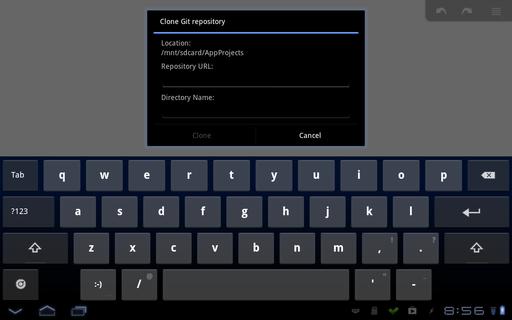 To see your other projects, click on the “..” entry in the file pane to move up one directory. Here, you should see three standard entries, then a folder for each of your projects. The first entry is a tool to let you clone a Git repository to your Android device. The dialog that pops up allows you to enter a repository URL and a directory name. If you already have done some development work and have the code on Dropbox, you can download the relevant folder directly within AIDE.