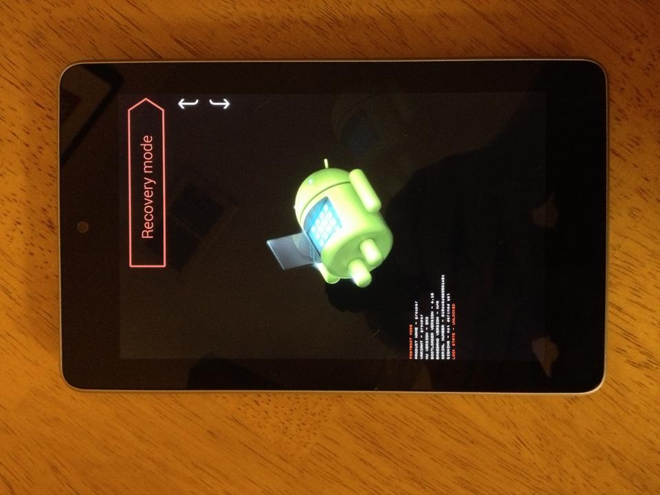Adding ROMs to MultiROM is fairly straightforward from here. Just hook your tablet up to your computer, drop the .zip file for the ROM you want to install onto the root of the filesystem, and then shut down the tablet. Restart your Nexus 7 in MultiROM by holding the “Volume Down” button while pushing the power switch. You'll see a screen with what appears to be the Android logo lying on its back (Figure 1). This is the bootloader. Push the “Volume Down” button until the red arrow at the top of the screen indicates “Recovery Mode”, then push the Power button. This will boot the Nexus 7 into MultiROM.