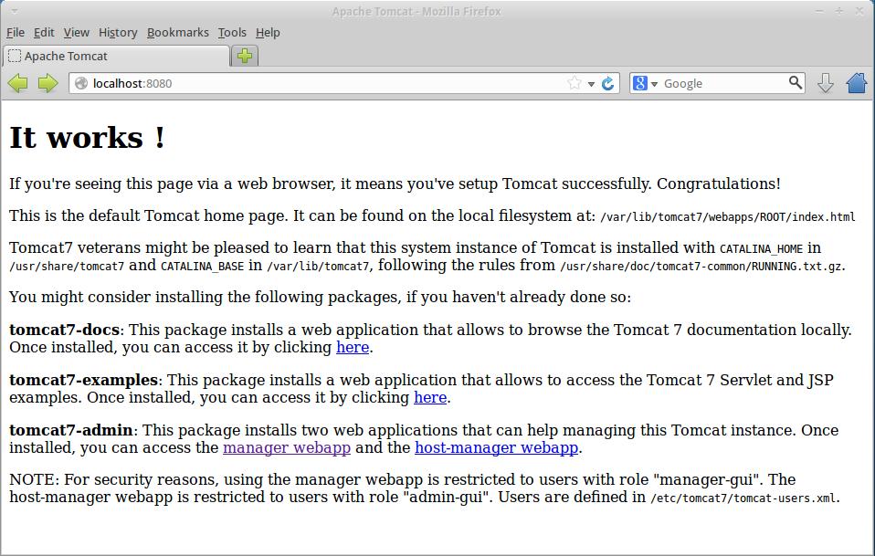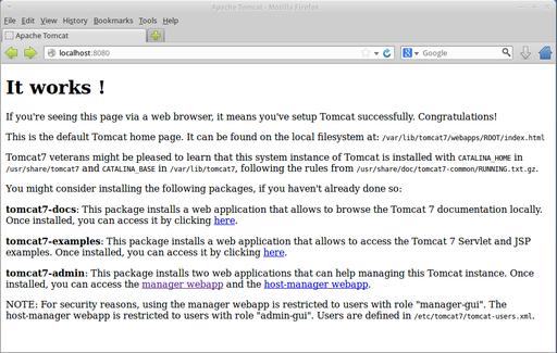 Unfortunately, the Internet has some non-trustworthy folks attached to it. By default, Tomcat's admin package disables all access. If you try to click on that admin link (even after installing the package), you won't be able to log in. You should get a login prompt, but there aren't any logins enabled. For that, you need to edit /etc/tomcat7/tomcat-users.xml, like it says at the bottom of the “It Works!” page shown in Figure 1. Basically, you need to add a line like this to the file: