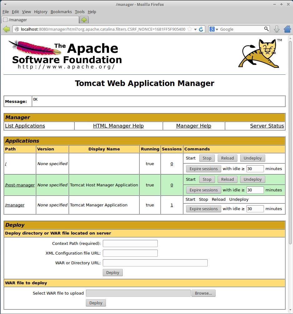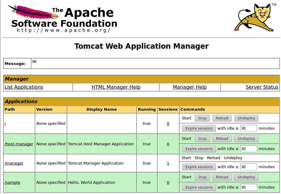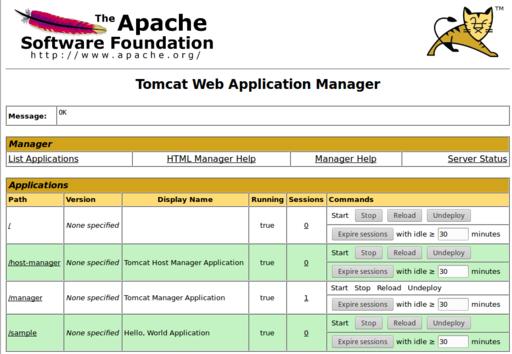 and you should be done. Nothing will be returned on the command line, but the Tomcat logs should show the application being deployed. Going back to the Web-based management app from Figure 2, you'd now see something like Figure 3, which shows the sample.war file fully deployed and active.