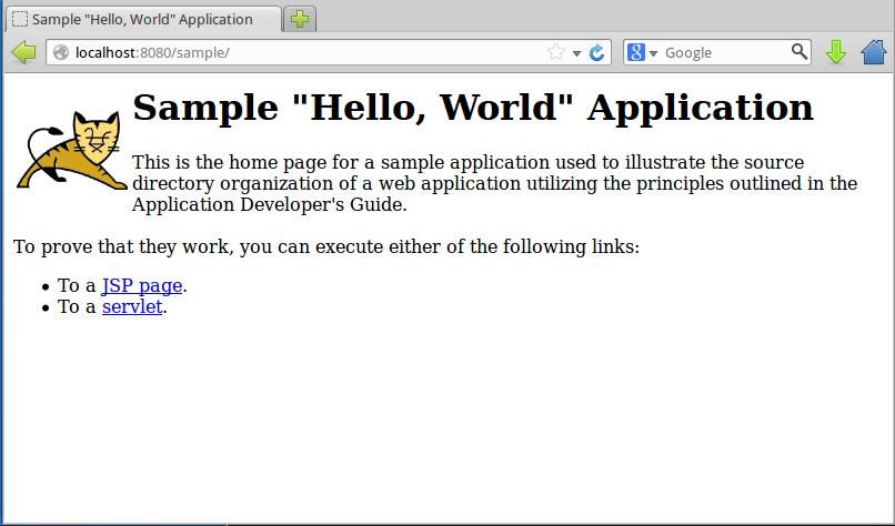 You should see no errors, and when you try to go to http://localhost/sample, you should see the same sample you deployed earlier, but this time, served from port 80. Note that there can be only a single dæmon listening on port 80, so you can't have the Apache Web server listening on port 80 (its default), and then expect Tomcat to work on the same port. Changing Tomcat to port 80 makes sense only if it's the only server trying to serve content on port 80. Hopefully, that makes sense.