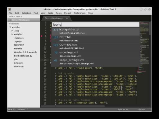 Part of Sublime Text's appeal is speed, both in terms of application performance and UI design. A wide array of highly customizable keyboard shortcuts make using the mouse optional. My most frequently used hotkey is called Goto Anything and is available from the Goto→Goto Anything menu item (Ctrl-p). Provided you have the relevant language support installed (more on that later), Goto Anything lets you quickly access files, classes, functions and even regular old variables as you type. For example, I'll open up my project's icongrabber.py file by pressing Ctrl-p, and as I type my desired filename, Sublime Text narrows down possible completions. When using Goto Anything, you can prefix your query with @ to find a symbol, # to search within a file or : to jump to a line number. Unfortunately, Sublime Text does not search symbols in unopened files.