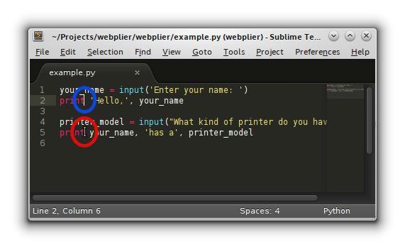 Using Sublime Text, such a task is easy. I'll select the first occurrence of “raw_input” and press Ctrl-d. Pay close attention, and you'll notice that both occurrences of raw_input are now selected, each with its own blinking cursor. As I begin to type the word “input”, both occurrences are replaced. It is true that such a change could have been accomplished easily with search and replace, but I've only scratched the surface with multiple selection.