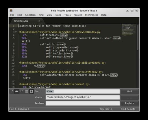 Forget grepping through your codebase when the time comes for aggressive refactoring. Sublime Text offers a powerful recursive search and replace feature. Recursive search and replace eliminates the need for the GNU grep and find commands for many users. Many editors provide recursive search and replace, although I find Sublime Text really gets it right in a way that few other projects do.