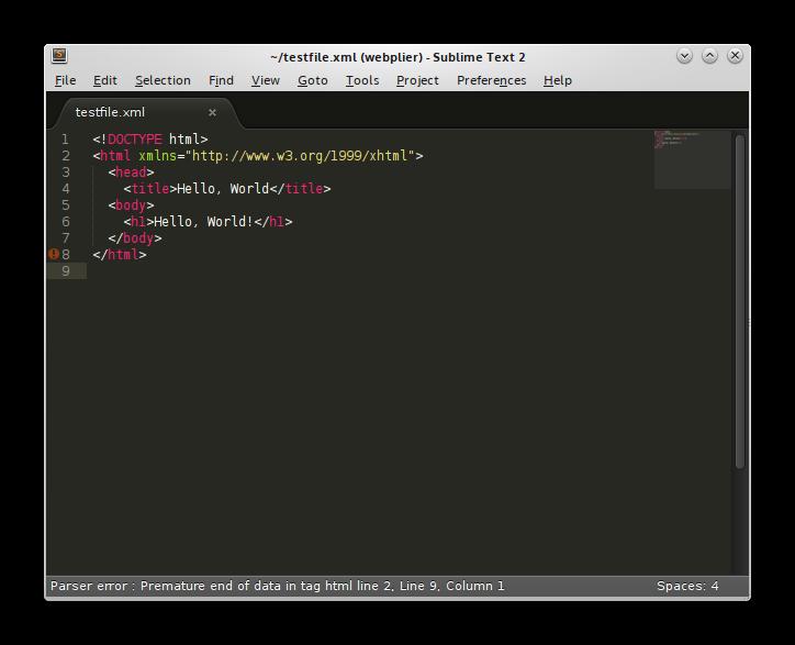 SublimeLinter wraps native language tools, such as cppcheck for C and xmllint for XML, so you'll need the relevant tool installed for your language. Let's try an XML error.