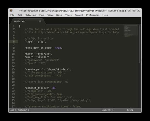 To get started, choose File→SFTP/FTP→Setup Server. Sublime Text will open up a file letting you specify a hostname, user name and so on. Sublime SFTP will use your default SSH keys, so if you've already configured logging in to your remote host, this will be easy. Settings for remote servers are stored as files in ~/.config/sublime-text-2/Packages/User/sftp_servers. Each file in this directory represents a remote server, and files can be directly manipulated to update settings.