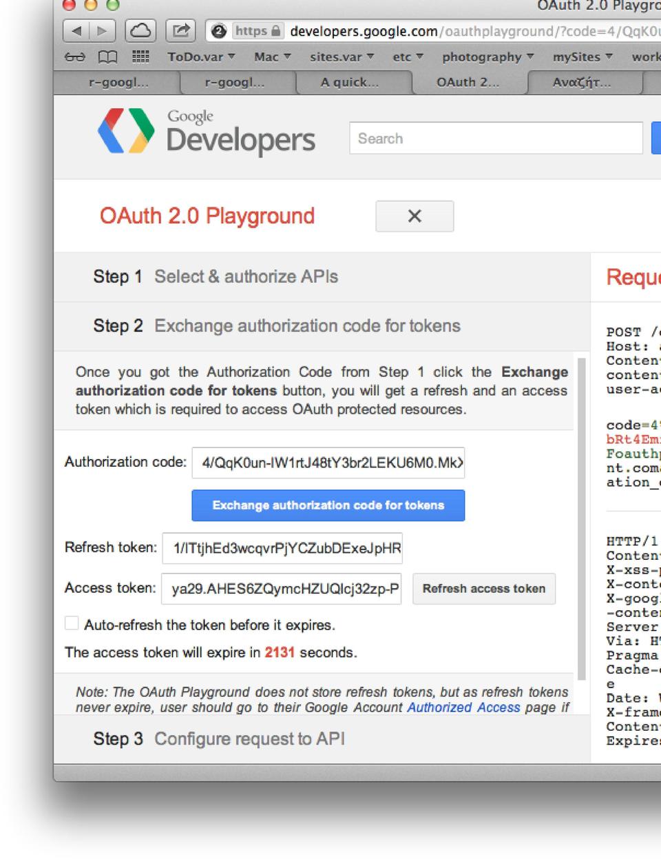 2) On the left side of the screen, click the button “Exchange authorization code for tokens” to generate the access token.