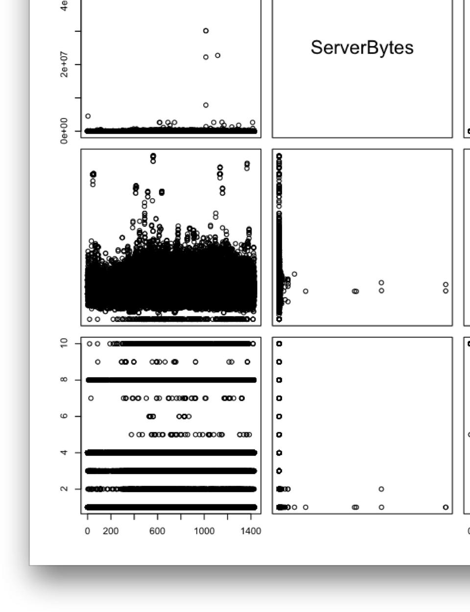Figure 2 shows the output of the pairs() command, which is impressive! As WWWDATA is a large data set, I had to wait a couple minutes for the pairs(WWWDATA) command to finish and produce its scatterplots.