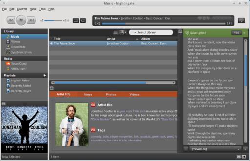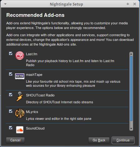 Nightingale is truly everything I want in a music player. It is simple, yet powerful. The default install makes listening to music an educational experience. In Figure 1 you can see that as my Jonathan Coulton song plays, I automatically see the lyrics, plus instant information on the artist. If that sort of information doesn't interest you, no problem, Nightingale is highly customizable with plugins, and there are dozens and dozens available from its Web site (Figure 2 shows a handful of plugins recommended during the installation process).