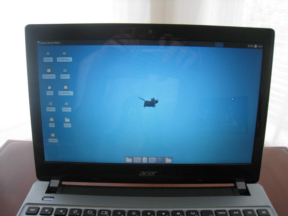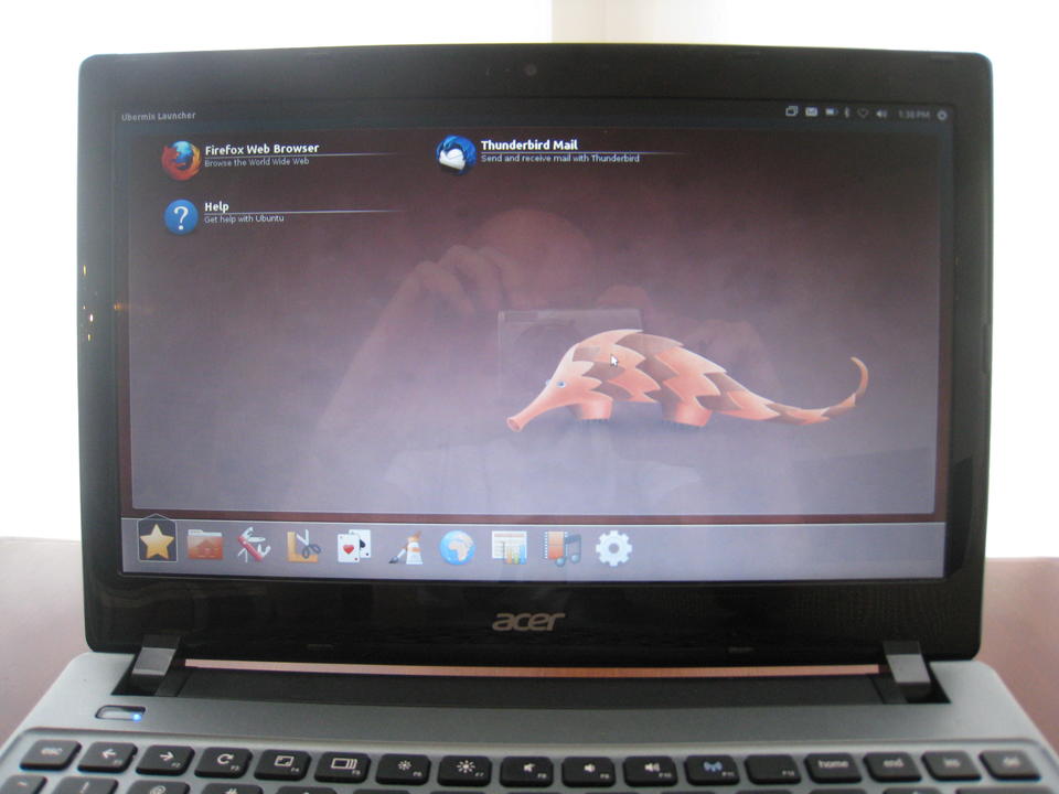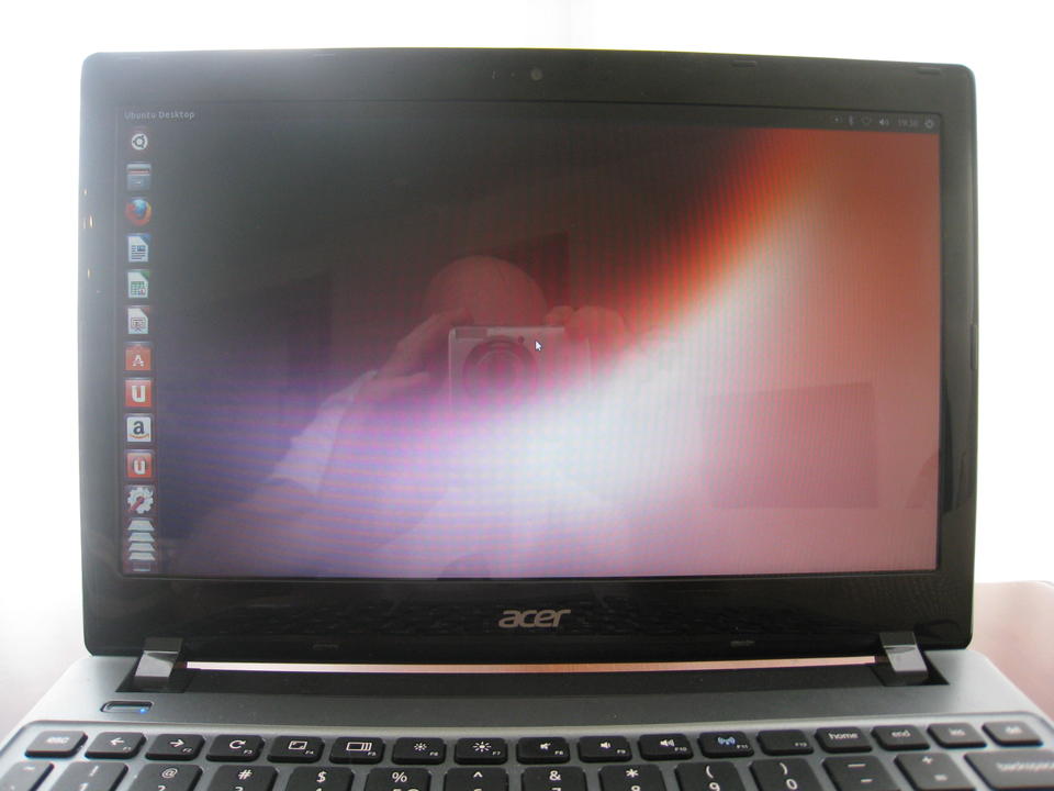 My time in the shell has been spent installing different Linux distributions, such as Ubuntu. The first approach I tried was dual-booting Ubuntu from a USB Flash drive using ChrUbuntu 12.04. Jay Lee created ChrUbuntu for the first Cr-48 Chromebook in 2010, and since then he has expanded this special build of Ubuntu 12.04 to other Chromebooks. Unfortunately, it has not been optimized for the Acer C7 yet. I still decided to give it a try. I entered Developer Mode and after about 45 minutes had ChrUbuntu installed on an 8GB USB drive. Ubuntu worked very well, but failed to resume correctly after going to sleep. In many cases, the user interface would come back up and screen pointer would move, but the icons would not work. I jumped to a terminal and also found, using top, that polkitd and dbus-daemon were continually consuming >50% of the CPU, and console-kit-daemon and NetworkManager were consuming around 10–15% each. Further, I noticed the C7 ran very hot, and the fan was quite audible.