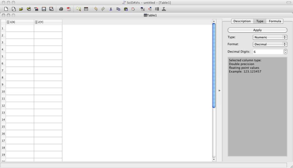 When you first start SciDAVis, you get an empty project and an empty data table with two columns of numeric values (Figure 1). Selecting a column displays the details of that column in a window on the right-hand side. Selecting the description tab lets you change the name of the column, as well as add a comment describing what the column represents. The type tab lets you change what kind of data you can enter for this column from numeric to text, month names, day names or full dates. You also can set the format of the data type for each column.