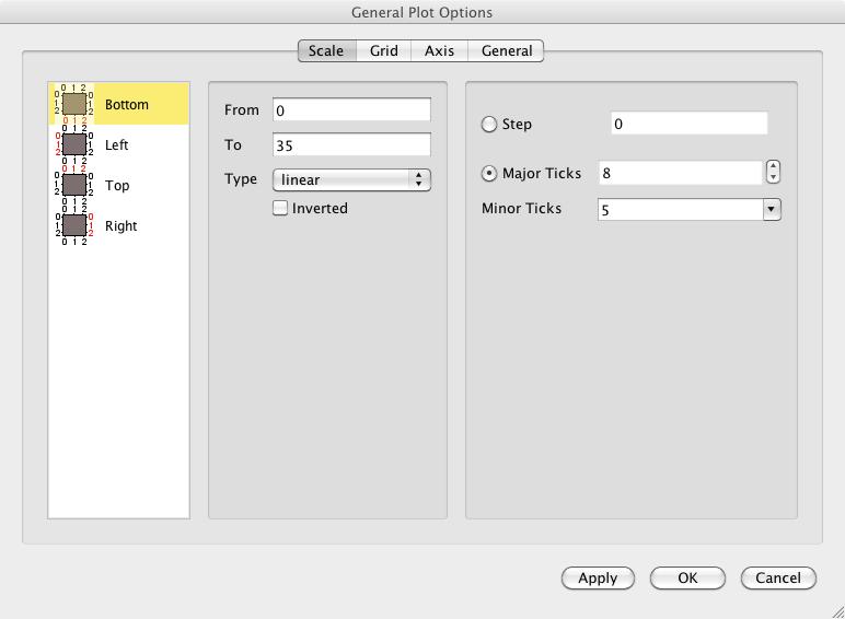 The point of SciDAVis is to make this type of work easy, so you can double-click on the various elements to edit the details of your graphs. Double-clicking on the title, or the axis labels, will pop up a window where you can change the content and the display. You also can change the details of the axes themselves. Double-clicking on an axis will pop up a new window where you can set the scale, the type of grid, the axis displays and a set of general options (Figure 4). Each of these sets of options is available under its own tab in the option window.