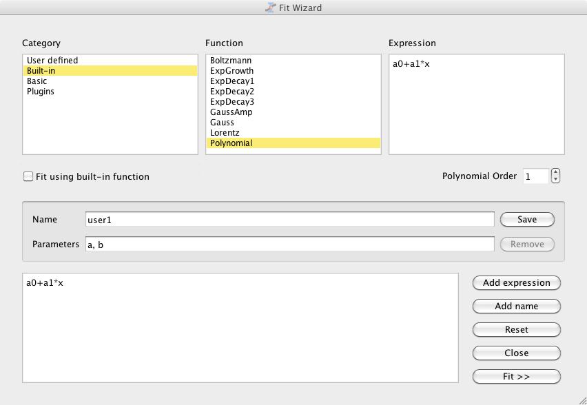 Once you have had a chance to look at your data, you may have started to form an idea of a model that represents the system you were measuring. An idea is not enough, however. You actually need to do some calculations and see whether your model fits the data you collected. Two options are available. The first is to use the Fit Wizard. You can access it by clicking on the menu item Analysis→Fit Wizard. This pops up a window where you can build a function describing your model. Once you have built up your model, click the button called Fit. This pops up a new window where you can select the details of doing the actual fitting of the generic function to your data. Here you can set the initial guesses and select the algorithm used to do the actual fitting (Figure 6).
