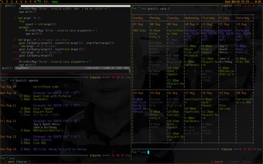 I've found the agenda output to be the most useful for seeing what's on my plate for the day; however, you also can use calw and calm to output ASCII-art-style weekly and monthly calendars, respectively (Figure 1).