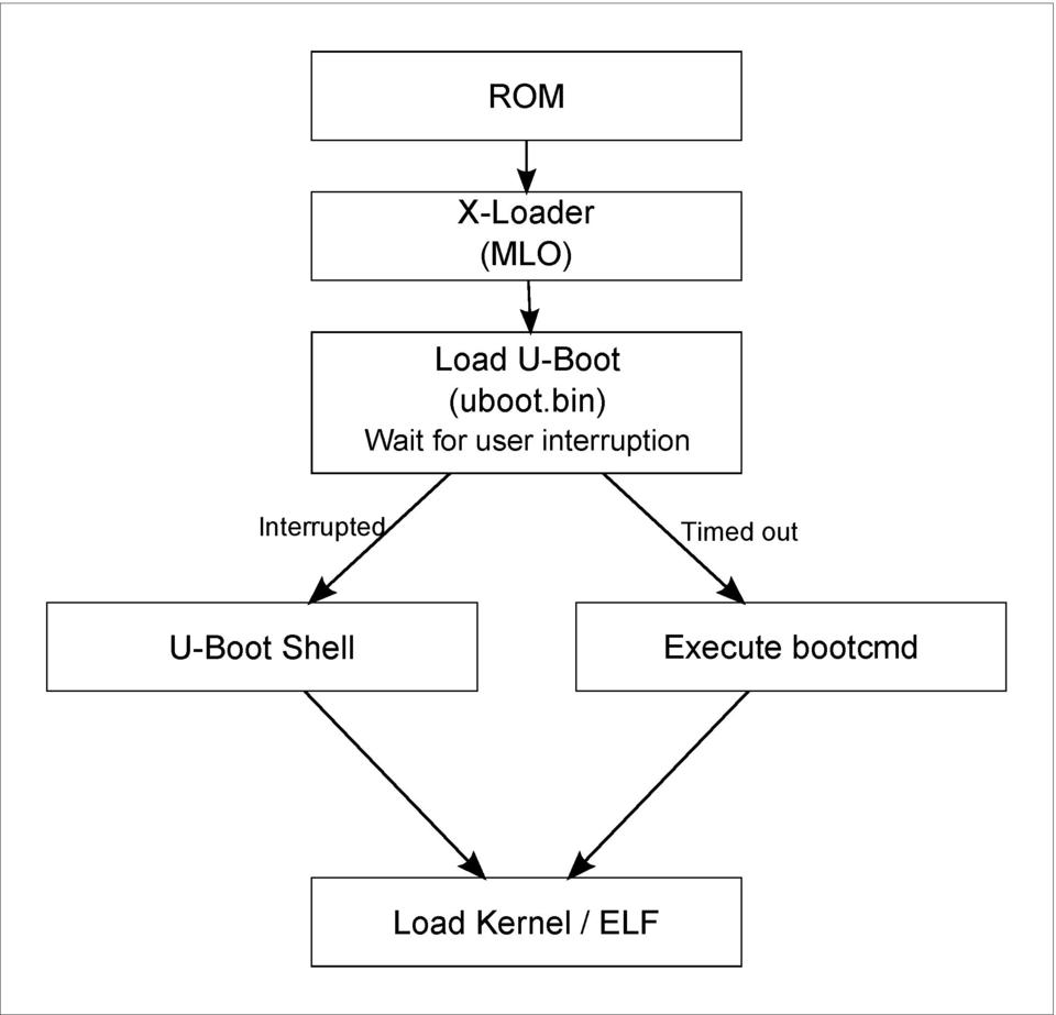 Figure 1 shows the default boot sequence of the BeagleBone Black. This sequence is more or less applicable to most embedded systems. The x-loader and U-Boot executables are stored in the files called MLO and uboot.img, respectively. These files are stored in a FAT32 partition. The serial port outputs of the BeagleBone are shown in Listings 1–3. The x-loader is responsible for the output shown in Listing 1. Once the execution is handed over to U-Boot, it offers you a few seconds to interrupt the boot sequence, as shown in Listing 2. If you choose not to interrupt, U-Boot executes an environment variable called bootcmd. bootcmd holds the search sequence for a file called uImage. This is the kernel image. The kernel image is loaded into the memory, and the execution finally is transferred to the kernel, as shown in Listing 3.