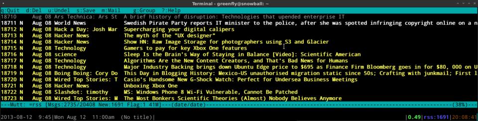 I decided to take a completely different tack and convert my RSS feeds to e-mail in a special mailbox and use an interface I already was used to: e-mail on the command line using mutt. I decided to use the rss2email program, written by the great Aaron Swartz, to manage my feeds. This software pulls down RSS feeds and converts each story into its own e-mail message that it sends to you. This means you can use whatever e-mail program you want to read your feeds, but of course, because we are focusing on the command line here, I am going to talk about only mutt.