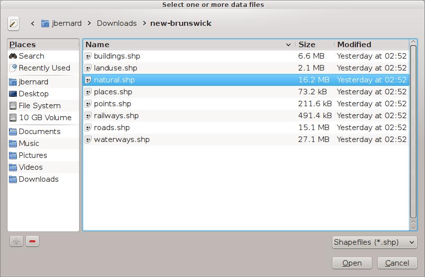 When you start Thuban, you end up with a completely blank slate (Figure 1). The first step is to start a new session, which you can do by selecting the menu item File→New Session (not much will change on the screen). In order to start building your map, you need to add layers that can be manipulated. I started by selecting the menu item Map→Add Layer and adding in an SHP file to give me the basic geographic attributes for my home province of New Brunswick (Figure 2). This includes several different geographical items, such as water, river banks and parks. The default display is not very interesting yet (Figure 3).