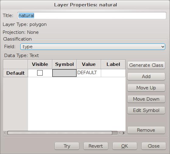 You can edit the way a layer is displayed either by double-clicking the layer within the list in the legend pane or by right-clicking the layer of interest and selecting Properties. This will pop up a new window (Figure 4). In this case, I selected the “type” field within the classification pane. The easiest choice at this point is to click the Generate Class button. The Generate Classification window will pop up, where you can click on the Retrieve From Table button to get a list of the possible values. I accepted the default gray-scale mapping for the colors, giving four new entries in the layer properties. But this is not very interesting either, yet. Selecting each of the new properties, you can edit the symbol and change the colors for each of the types (Figure 5). If you want to have a preview of what this will look like, you can click the Try button. If it doesn't quite look right, you always can click the Revert button to undo the changes and try something else.
