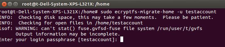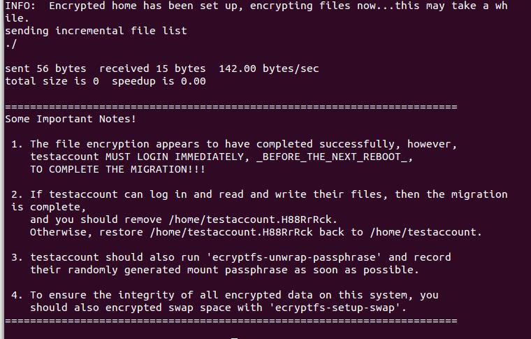 Figure 3. This is important feedback information “record passphrase as soon as possible” that will be generated from the encryptfs-migrate-home command.