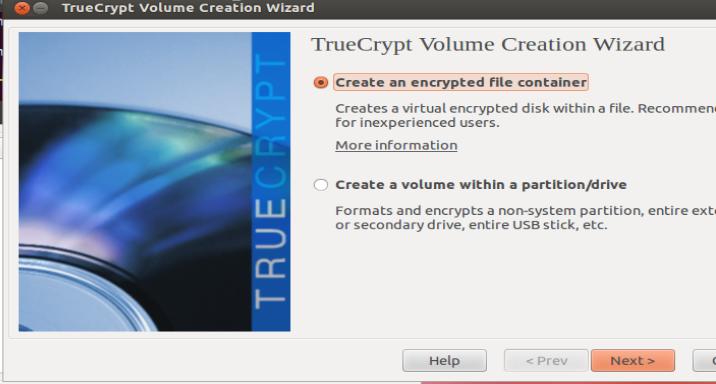 The next step is to create an encrypted container. This container will store personal identifiable information (PII) or any file that you want to keep safe on your local computer, and it will create another layer of security. The process for creating a basic container is by selecting the default options during initial installation (Figure 4). Once the software is installed, starting the application is a breeze using the command truecrypt & or via the GUI menu system by selecting the create volume button.