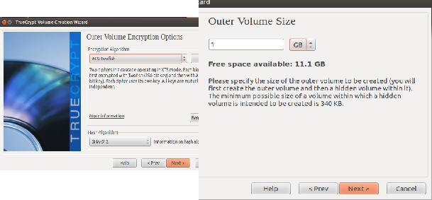 Figure 8. After the standard volume is selected, the next options are to select the encryption and hash algorithms, and size of the volume.