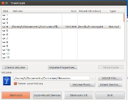 The next step is to select your preferred filesystem type (ext3, ext4 and so on). Once the volume-creating process is completed, mount your volume using the TrueCrypt application and start saving your private files to this encrypted container.