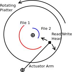 Traditional hard disk drives (HDDs) have two mechanical delays that can come into play when reading or writing files: pivoting the read/write head to be at the right radius and waiting until the platter rotates until the start of the file reaches the head (Figure 1). The time it takes for the drive to get in place to read a new file is called seek time. When you hear that unique hard drive chatter, that's the actuator arm moving around to access lots of different file locations. For example, my hard drive (a pretty typical 7,200 RPM consumer drive from 2011) has an average seek time of around 9ms.