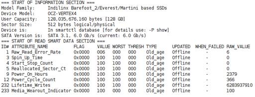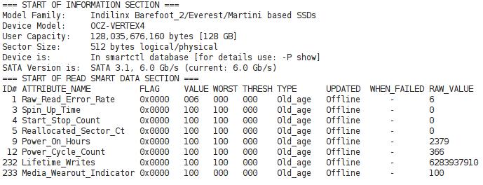 I already covered running tune2fs -l <device> as a good place to get statistics on a filesystem device, but those are reset each time you reformat the filesystem. What if you want to get a longer range of statistics, at the drive level? smartctl is the tool for that. SMART (Self-Monitoring, Analysis and Report Technology) is part of the ATA standard that provides a way for drives to track and report key statistics, originally for the purposes of predicting drive failures. Because drive write volume is so important to SSDs, most manufacturers are including this in the SMART output. Run sudo smartctl -a /dev/<device> on an SSD device, and you'll get a whole host of interesting statistics. If you see the message “Not in smartctl database” in the smartctl output, try building the latest version of smartmontools.