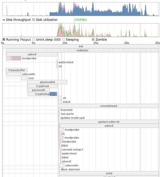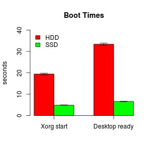 Because I'm the only user on the test workstation and use whole-disk encryption, X is set up with automatic login. Once cryptsetup prompts me for my disk password, the system will go right past the typical GDM user login to my desktop. This complicates how to measure boot times, so to get the most accurate measurements, I used the bootchart package that provides a really cool Gantt chart showing the boot time of each component (partial output shown in Figure 4). I used the Xorg process start to indicate when X starts up, the start of the Dropbox panel applet to indicate when X is usable and subtracted the time spent in cryptsetup (its duration depends more on how many tries it takes me to type in my disk password than how fast any of the disks are). The SSD crushes the competition here.