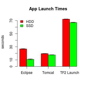 There was quite a bit of variation between the three applications, where Eclipse benefited from an SSD the most, and the gains in Tomcat and TF2 were present but less noticeable.