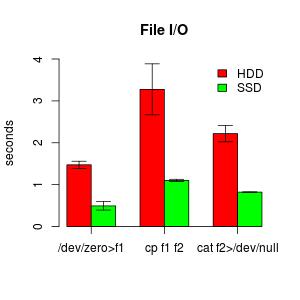To test single-file I/O speed, I created a ~256MB file via time dd if=/dev/zero of=f1 bs=1048576 count=256, copied it to a new file and then read it via cat, redirecting to /dev/null. I used the time utility to capture the real elapsed time for each test.