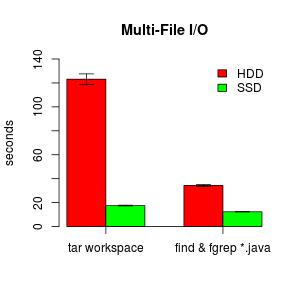 First, I archived the 200k files in my 1.1GB Eclipse workspace via tar -c ~/workspace > w.tar to test archiving speed. Second, I used find -name "*.java" -exec fgrep "Foo" {} > /dev/null to simulate looking for a keyword in the 7k java files. I used the time utility to capture the real elapsed time for each test. Both tests made the HDD quite noisy, so I wasn't surprised to see a significant delta.