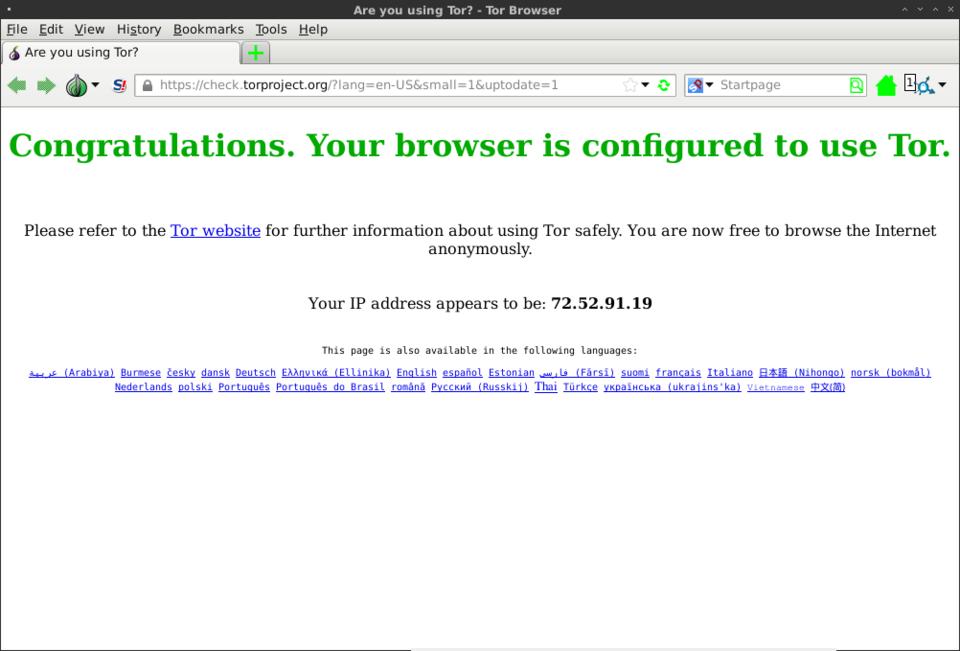 The initial Tor check page not only validates that you are using the Tor network, it also displays your current IP address. If you ever notice that IP address matches your home IP address, or if you don't see this congratulations window at all, for some reason your Tor instance isn't working properly, so you shouldn't do anything within the browser that is privacy-sensitive. Note that because you may be exiting the Tor network from an exit node in a different country, certain sites like Google, for instance, that try to be helpful and display the site in a country's native language may present you with Japanese, German or some other language as you visit.