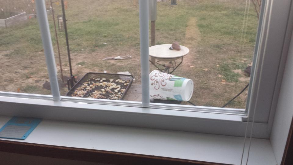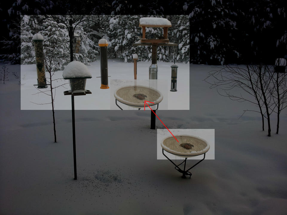 Figure 2. My old cell phone takes really high-resolution photos. I was able to clip out the birdbath and overlay it nicely to get a closeup of the feeders.
