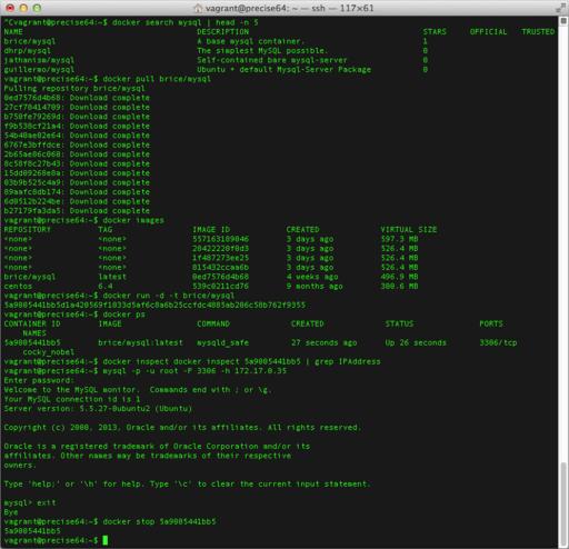 Start by issuing the docker search mysql command, which then displays a list of images in the public Docker registry that match the keyword “mysql”. For no particular reason other than I know it works, let's download the “brice/mysql” image, which you do with the docker pull brice/mysql command. You can see that Docker downloaded not only the specified image, but also the images it was built on. With the docker images command, you list the images currently available locally, which includes the “brice/mysql” image. Launching the container with the -d option to detach from the currently running container, you now have MySQL running in a container. You can verify that with the docker ps command, which lists containers, rather than images. In the output, you also see the port on which MySQL is listening, which is the default of 3306.
