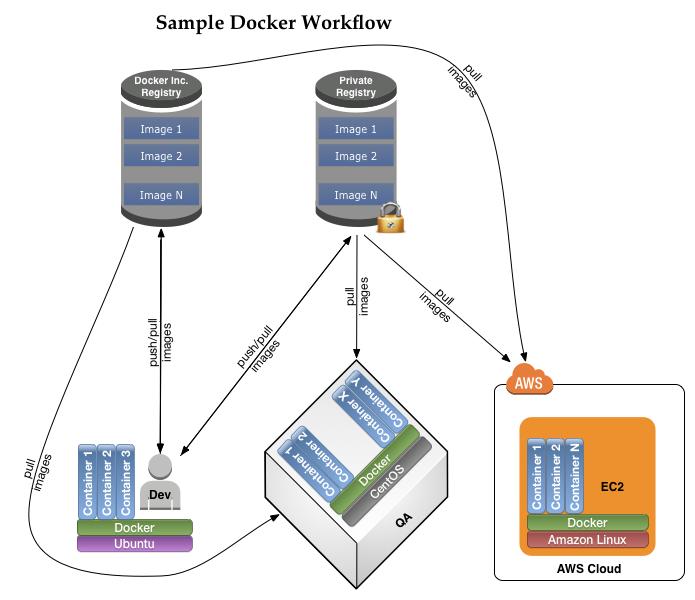 There are various ways in which Docker can be integrated into the development and deployment process. Let's take a look at a sample workflow illustrated in Figure 4. A developer in our hypothetical company might be running Ubuntu with Docker installed. He might push/pull Docker images to/from the public registry to use as the base for installing his own code and the company's proprietary software and produce images that he pushes to the company's private registry.