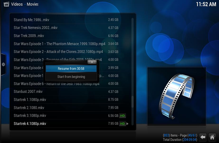 Now that the hard work is done, subsequent XBMC installs will be much, much simpler. Just install the base system, and then copy the sources.xml and advancedsettings.xml from your original system to the new system. Reboot the new system, and everything should be configured perfectly with shared metadata. To test it out, start watching a movie from the first XBMC system, and halfway through, press stop. Then go to the second system, and start to play the same video. You should be asked if you want to continue from where you left off, even though you're on a completely new device (Figure 3).