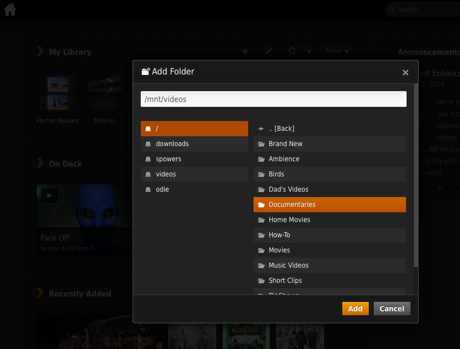 Figure 5. Plex requires videos to be in a local folder, but that folder certainly can be a network-mounted server.
