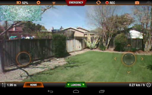The A.R. Drone has a bunch of onboard instrumentation. There's two cameras, one in the nose and one in the belly, and the cameras feed video back to the smartphone app for first-person perspective while flying. It's also got an onboard ultrasonic altimeter and an accelerometer to measure tilt and acceleration. Using these instruments in concert with the smartphone app allows the A.R. Drone to do things for you that are usually really hard, such as station-keeping while hovering with the wind blowing. The pilot doesn't have to compensate for the wind, as the A.R. Drone does all the hard work. The smartphone app has very intuitive controls, as well. To take off, you simply tap the “Take Off” button at the bottom of the screen, and the drone will lift off and hover in front of you, approximately two feet off the ground. From there, you just tap and hold on the left side of the screen to engage the accelerometer controls, and tilt your smartphone in the direction you want the drone to go. On the right side of the screen, you just tap and hold, then slide up and down to control altitude, or slide left and right to spin the drone around. If you lift both fingers from the phone's screen, the drone will stop all maneuvers and station-keep, hovering in place.