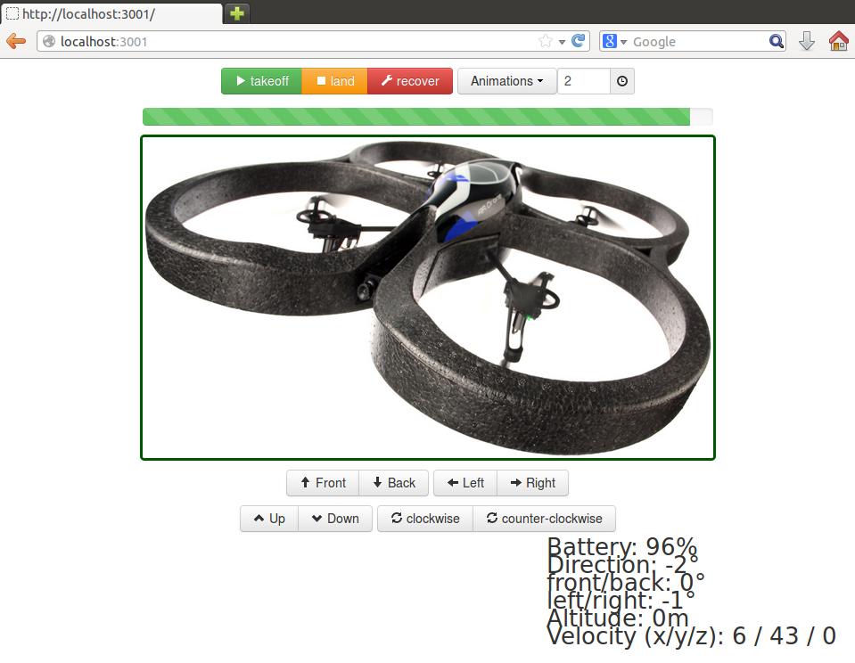 It's the processes running on those ports 5554, 5555 and 5556 that I'm going to continue to explore. If you can feed the right kind of data to the A.R. Drone on these ports, you can replace the smartphone app with your own program, running on a computer. That'd give you the ability to begin to make the drone truly autonomous. Exploring how to make the drone fly is beyond the scope of this article, as it'd involve reverse-engineering the A.R. Drone protocol and writing your own software. However, there's a lot of smart people out there on the Internet, and they've done that for you. Let's start off by trying out “drone-browser” (see Resources), a rudimentary Web-based UI for the A.R. Drone.