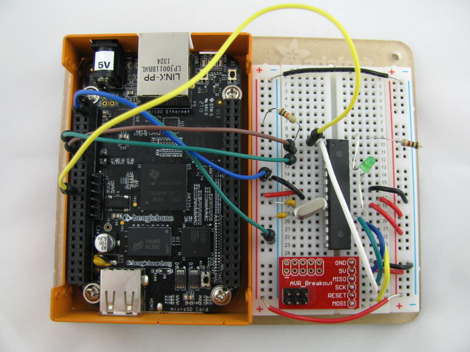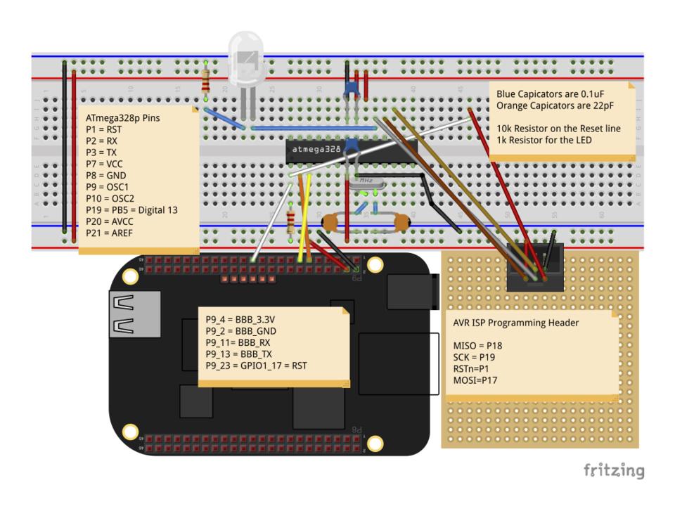In this project, I describe how to combine the ATmega328p, the microprocessor on the Arduino UNO, with the BBB. Specifically, I detail the steps needed to use the BBB as a programmer for the ATmega328p so that you can upload sketches built with the Arduino IDE directly to the chip!