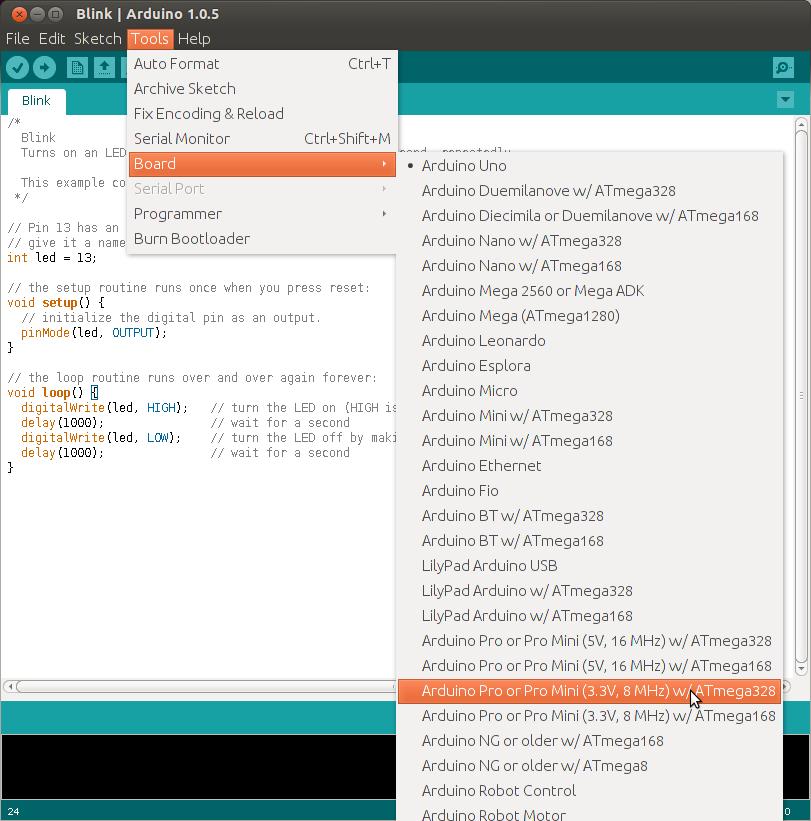 With the hardware in place and the interfaces ready, there are two pieces remaining. You need a mechanism to transmit sketches from the host computer to the BBB, and then you need a mechanism to upload the sketch to the ATmega328p. The first piece can be solved in numerous ways. I wrote a simple Python Web server that receives sketches via a POST and then launches the script to flash the ATmega328p. There are lots of examples of how to do this in Python, so I'll leave this as an exercise for the reader. Although, you can take a look at server.py in my GitHub repo for this tutorial listed in the Resources section for an example.