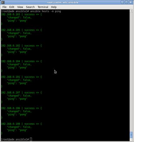 It also is possible to use Ansible modules in ad hoc mode by using the -m option. In this example, Ansible pings the target hosts using the ping module: