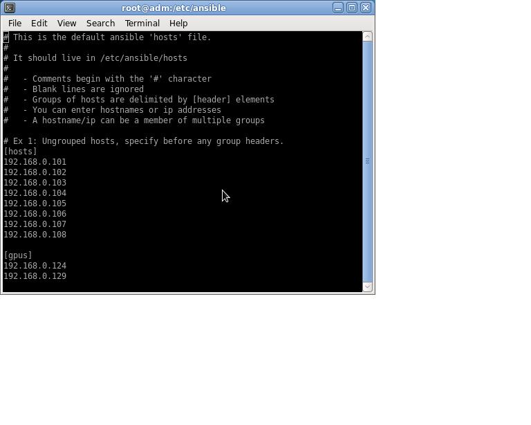 Eight of the compute nodes are typical nodes, but two are equipped with GPGPUs, so there are two groups: “hosts” and “gpus”. Provide the IP address of each node (the host name also can be given if your DNS is set up properly). With this tiny bit of configuration, Ansible is now functional. To test it, use Ansible in ad hoc mode and execute the following command on your management node: