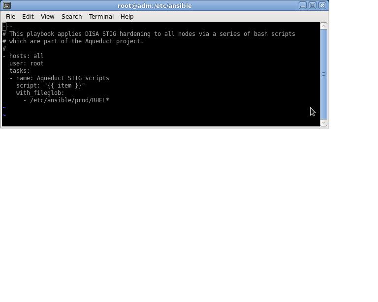 Vincent Passaro, Senior Security Architect at Fotis Networks, pilots the Aqueduct project, which consists of the development of both bash scripts and Puppet manifests. These are written to deploy the hardening guidelines provided in the STIGs. Also included are CIS (Center for Internet Security) benchmarks and several others. On the Aqueduct home page, Passaro says, “Content is currently being developed (by me) for the Red Hat Enterprise Linux 5 (RHEL 5) Draft STIG, CIS Benchmarks, NISPOM, PCI”, but I have found RHEL6 bash scripts there as well. I combined these bash scripts to construct a very basic Ansible playbook to simplify security hardening of RHEL6 systems. I accomplished this by using the included Ansible module called script.