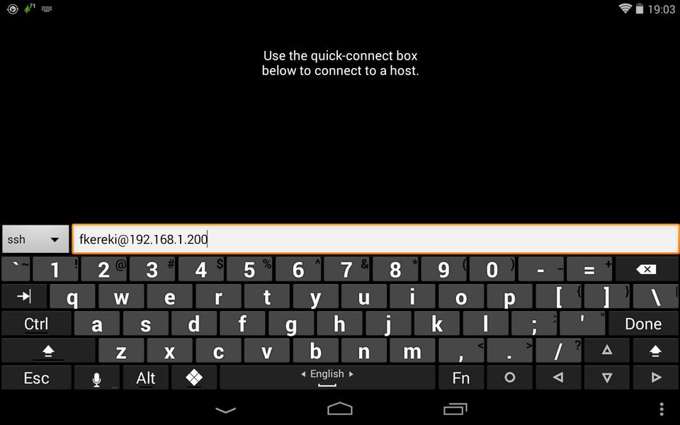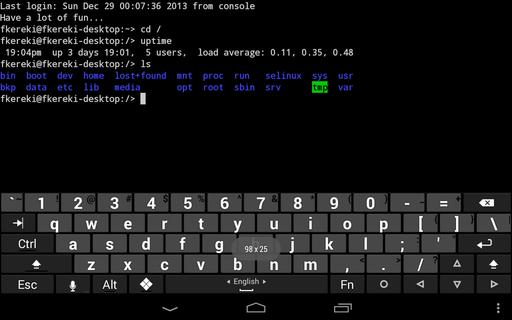 You can use ConnectBot either in portrait or in landscape mode, but the latter is best, especially for using the “Hacker's Keyboard” and getting all the usual PC keys. The small console text can be hard on your eyes, so you can use the volume up and down keys to increase or reduce the font size. For even more screen space, you can remove the status line in Settings.