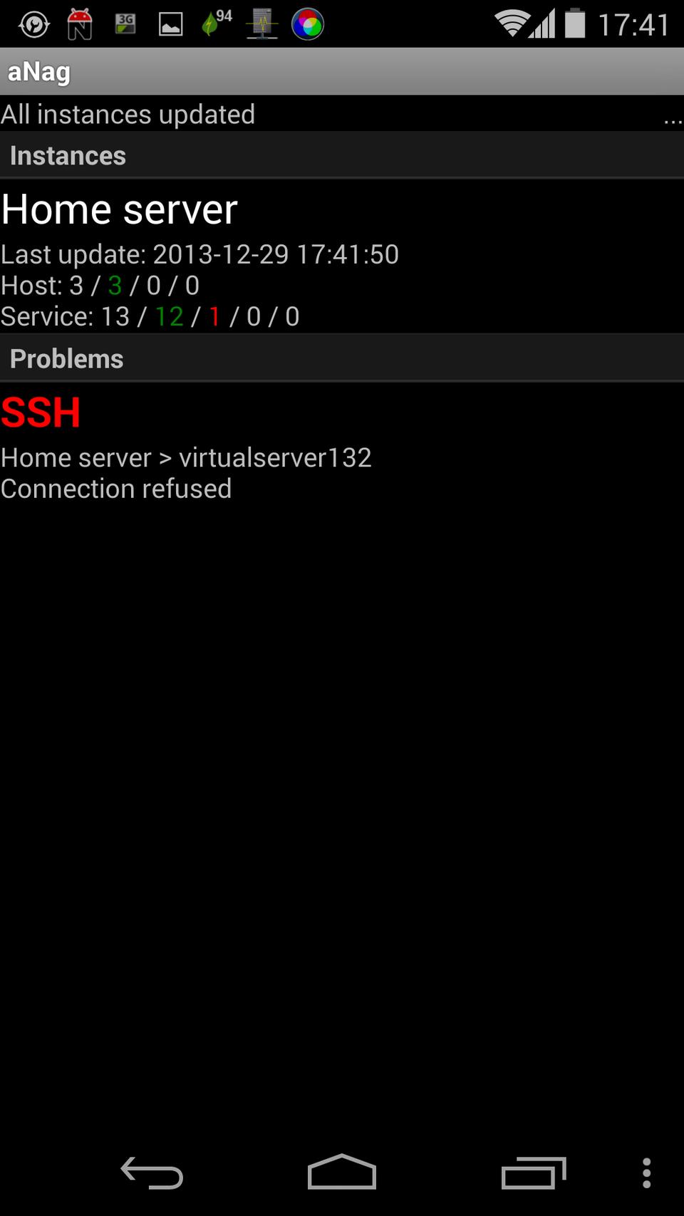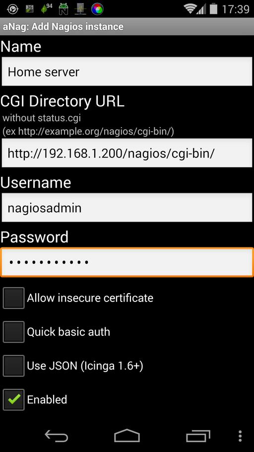 Basically, aNag works by connecting to your Nagios instances, scraping their Web pages, and summarizing and consolidating the information within in order to present it more compactly. To configure it, go to its settings, and define one or more Nagios instances. You'll need to specify its name, the URL for the CGI Web access excluding the final “status.cgi” (this parameter usually looks like http://your.own.site/nagios/cgi-bin/, but check your installation), user name and password for Nagios access, or possibly some extra parameters for custom authentication schemes.