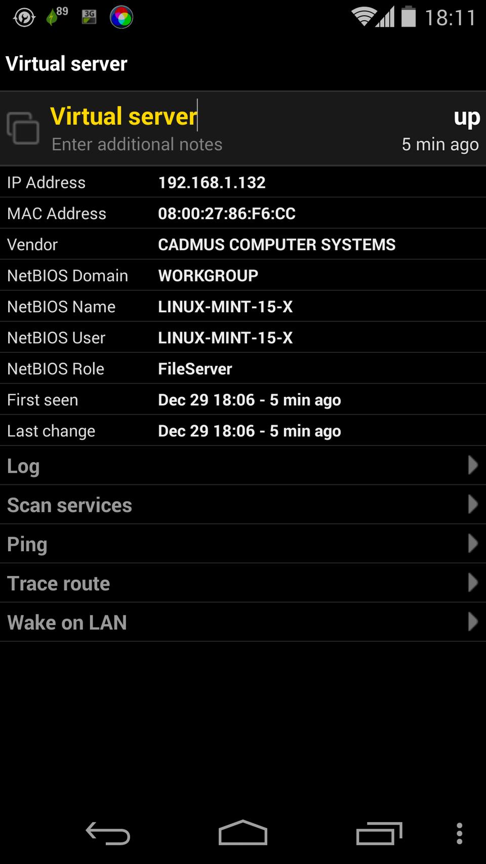 Tap on any entry to get full details, including IP address, MAC address, vendor, NetBIOS data (Domain, Name, User and Role) and more. You also can choose an appropriate icon, name and description for each piece of equipment. Plus, you can tap on “Scan Services” to determine all open ports, “Ping” and “Trace Route” (the equivalents of the command-line ping and traceroute commands), and “Wake on LAN” to wake up a computer remotely.