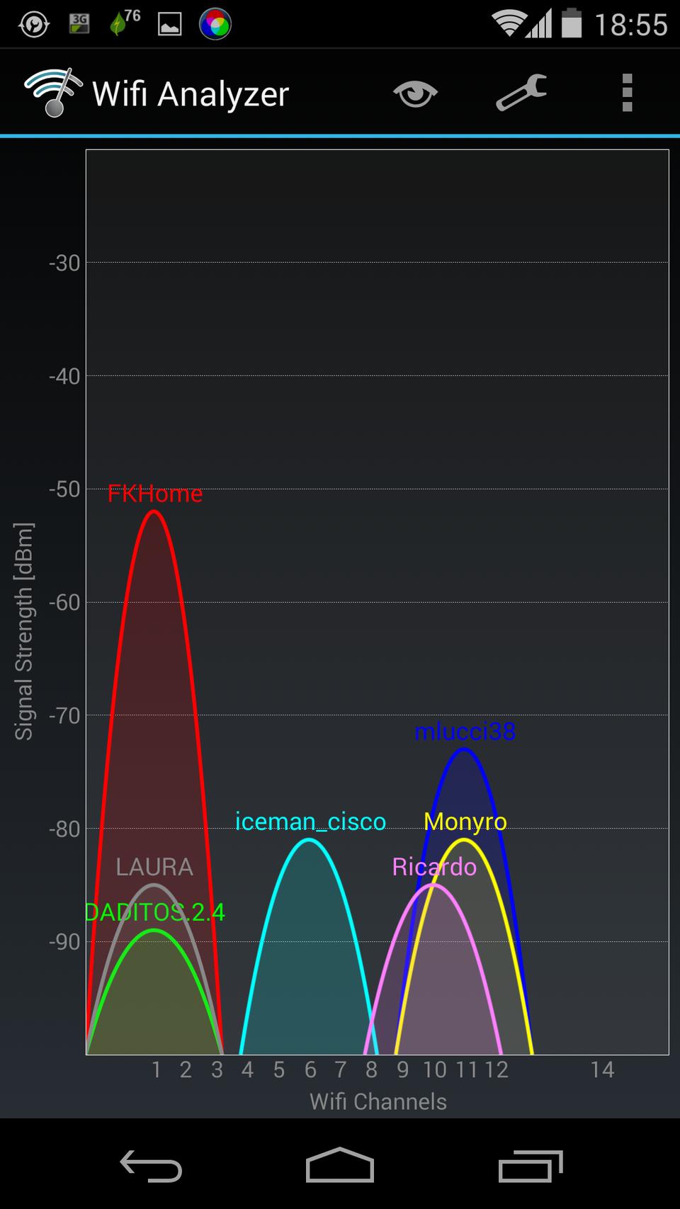 Configuring or debugging Wi-Fi setups is also a typical task, and for this, I use Wifi Analyzer. This app provides five useful tools: a channel graph, time graph, channel ratings, access points (AP) lists and a signal meter. The channel graph view shows all available networks (either in 2.4GHz or in 5GHz—touch the icon to the left to select which) along with their channels and signal strength.