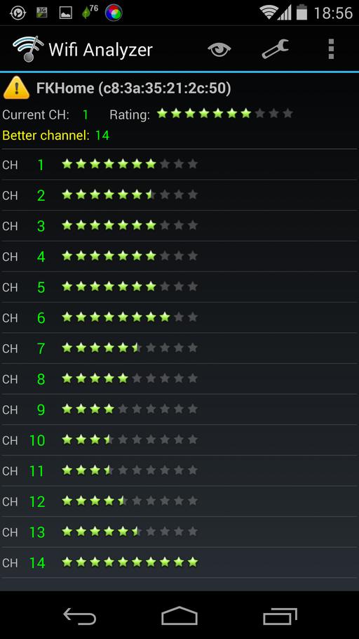 The “Time Graph” view shows the different AP's strengths over time. Available AP's are at the top of the screen and are color-coded, and if you tap on one, its graph will be highlighted. To determine which channel to assign to an AP, use the “Channel Rating” view, which shows a horizontal bar graph, pointing out which would be the best options for the AP, in terms of interference with other nearby networks, on a scale from 0 to 10. Take care to configure the app and select which channels are available. In the US, there are channels 1 to 11, but 12, 13 and 14 are available in other regions. If your AP isn't using the best option, just configure it and fix the problem.